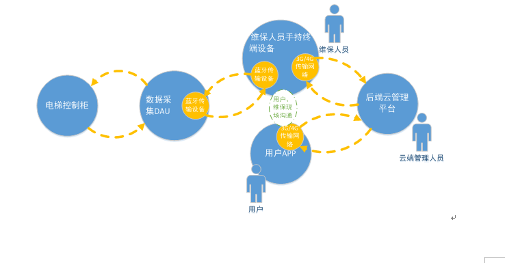 基于蓝牙和移动数据通信技术的物联维保管理系统是专门针对上述问题而设计和开发的,维保管理系统由带蓝牙的DAU数据采集设备、 TMCS通信服务器、维 保手持终端设备、后台云服务器、用户端APP组成,为企业的后期维护提供一个可视化、远程化、智能化、网络化的管理平台。 平台提供了远程后台状态监控、备件管理、维保评估、维保订单管理分配、保养记录、故障调试、远程协助、维保人员管理、客户评价管理等功能模块, 通过该平台实现了厂方、维护保养方、客户使用方的三方互动,互动的模式下不仅增加客户对厂方的信任和依赖,同时也减少了厂方对产品状态的不确定性和不可控性。
